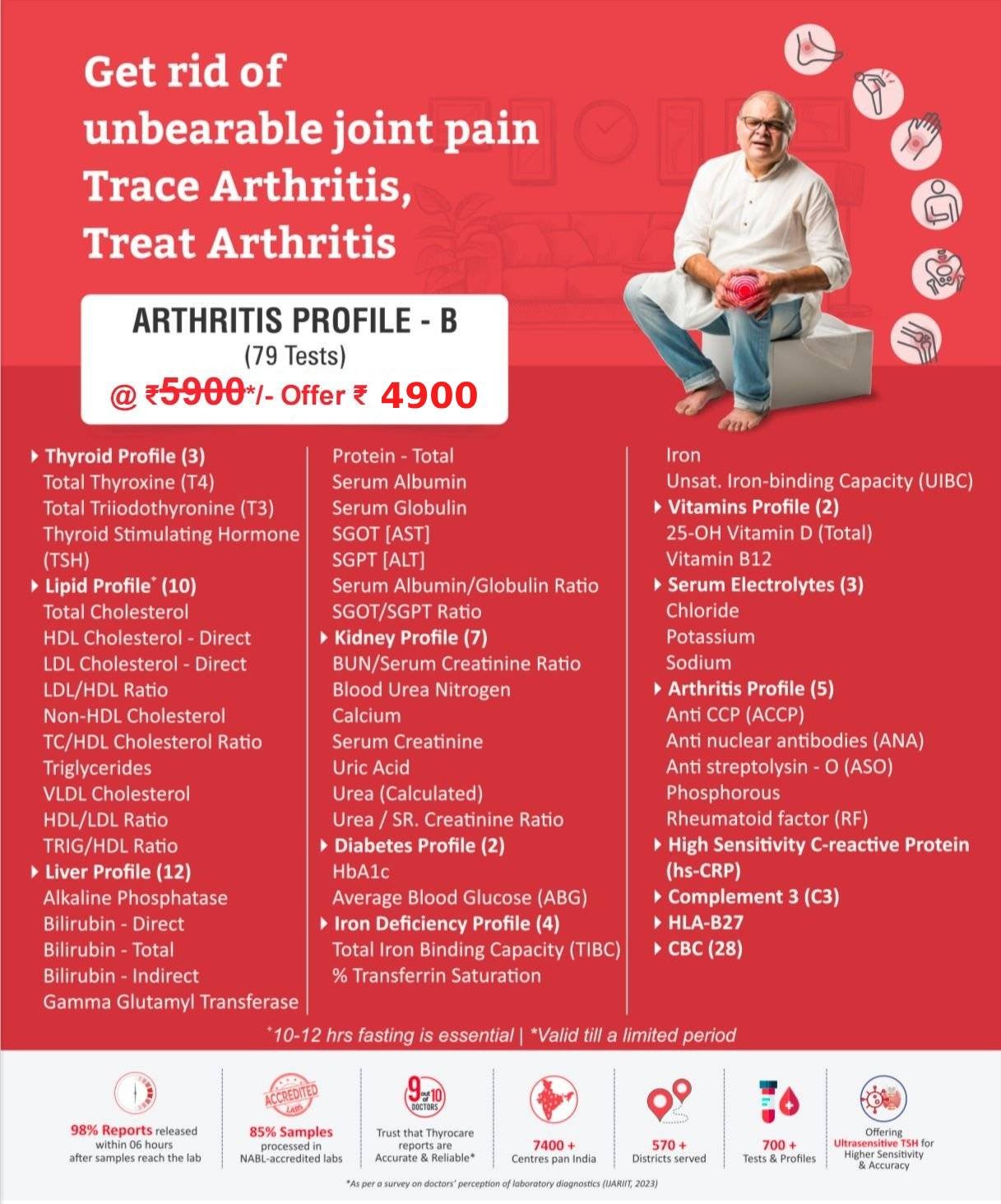 Aarogyam E Plus Profile (Includes CARDIAC RISK MARKERS-HOMOSYSTEINE, ARTHIRITIS PROFILE, PANCREAS)